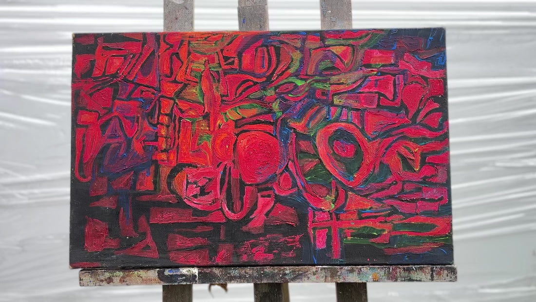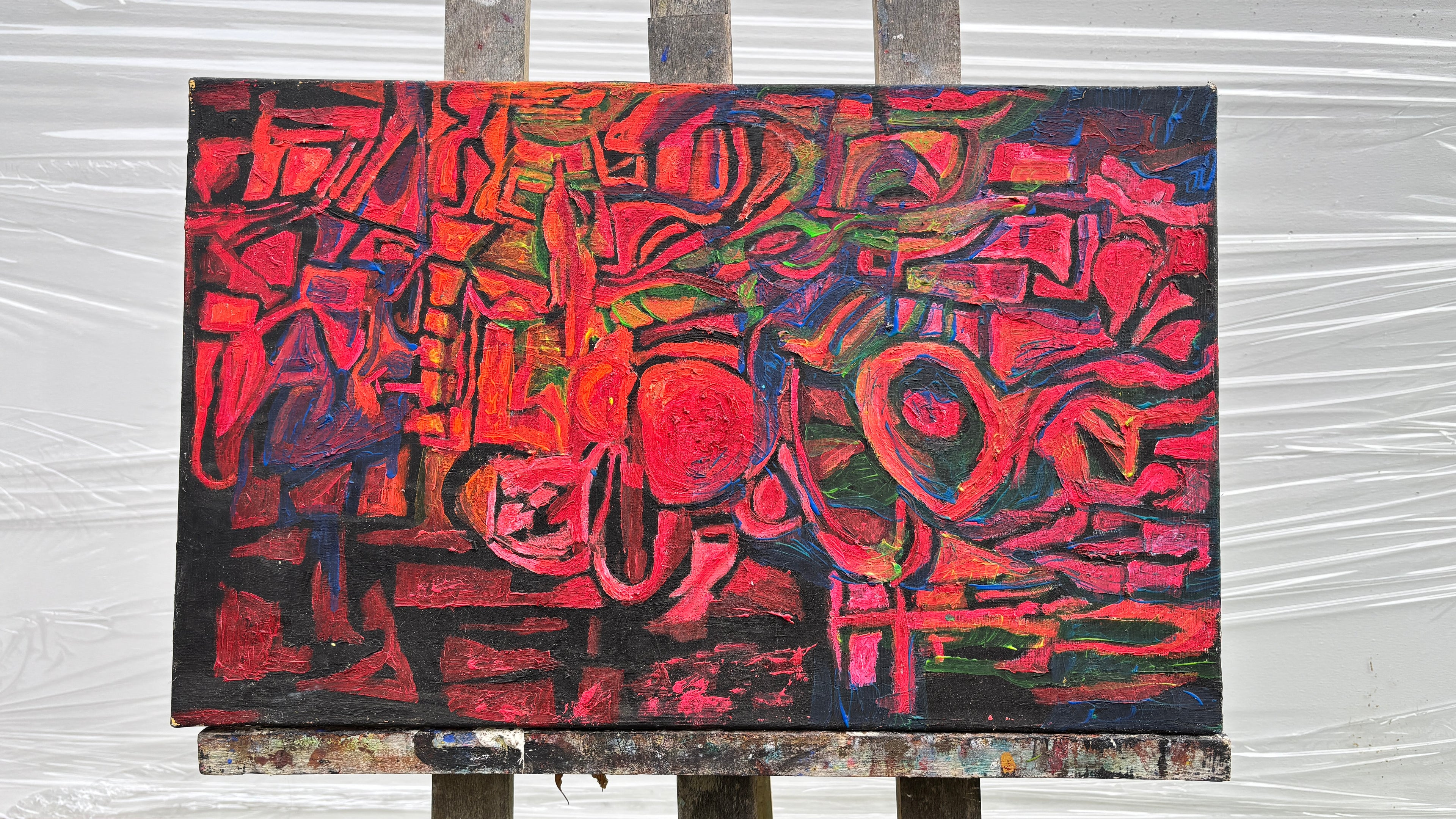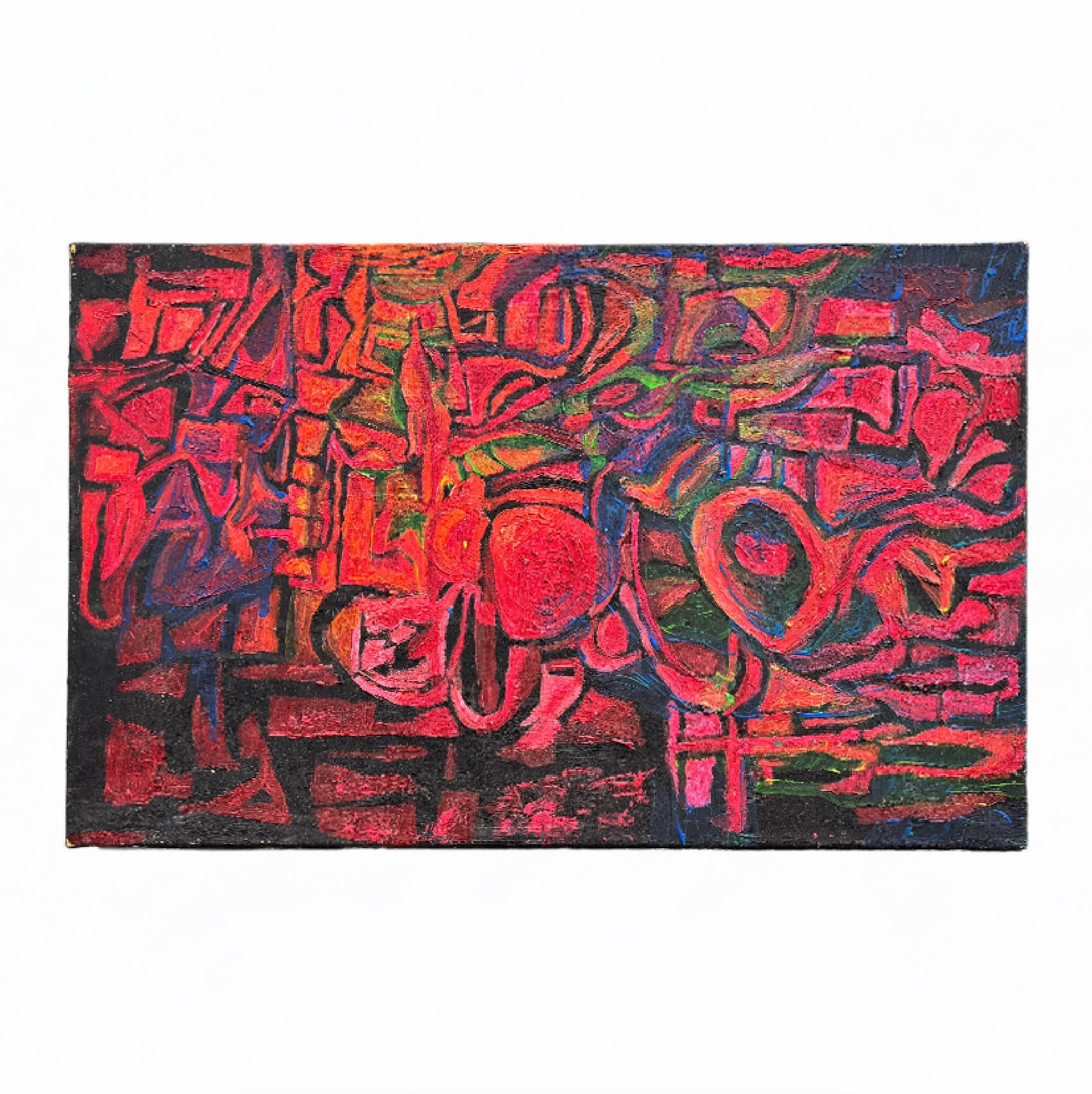 A vibrant abstract composition painted with gesso and neon pigments, bursting with intense reds, pinks, and electric undertones. Dense interwoven shapes create a rhythmic, maze-like structure, while the bold neon colors energize the surface with a glowing, pulsating effect.