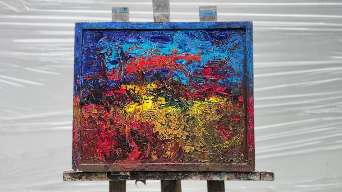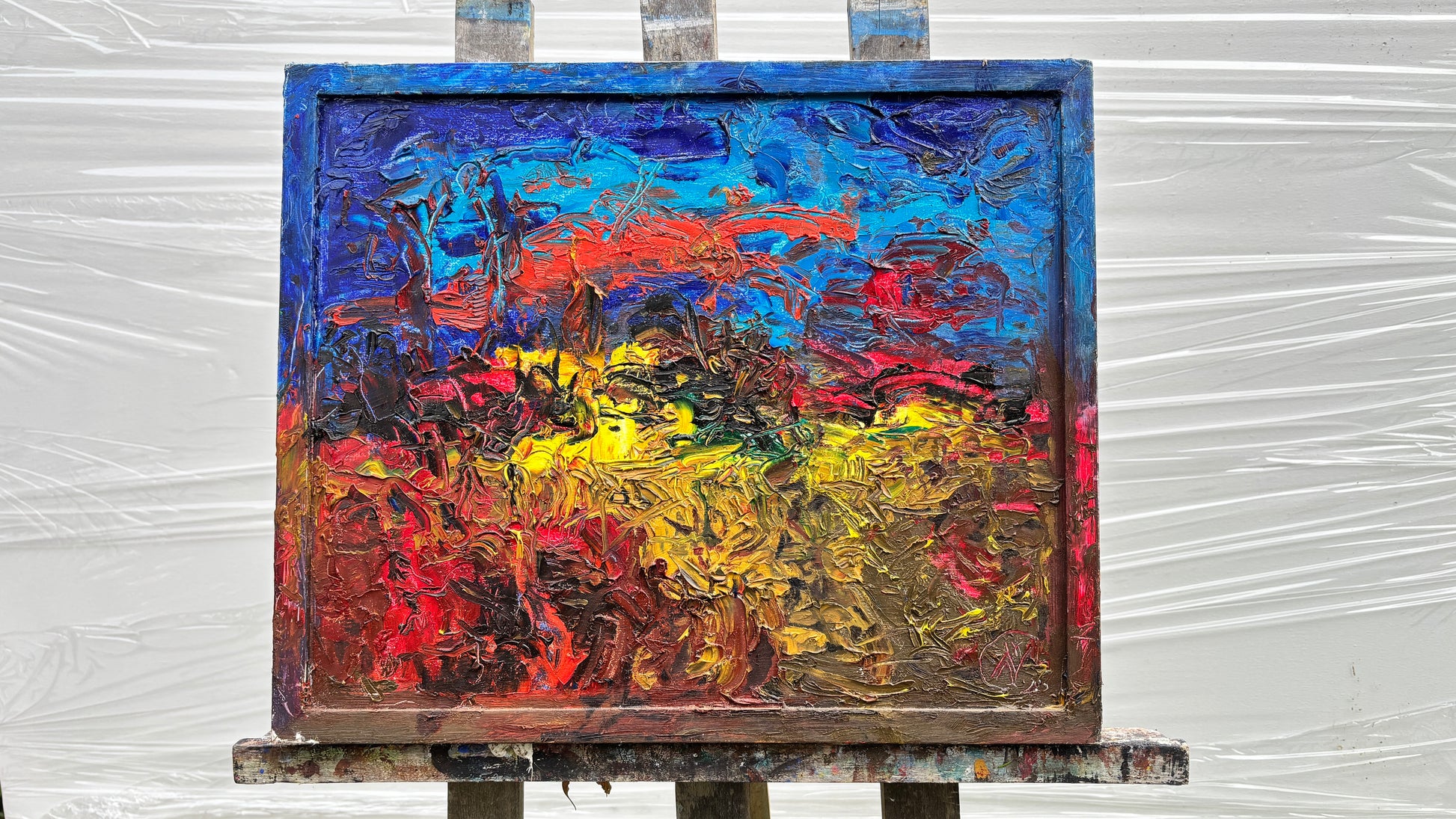 A highly textured, emotionally charged abstract landscape built with thick, expressive strokes of impasto oil paint. The piece radiates energy through its bold contrast of warm and cool color fields.