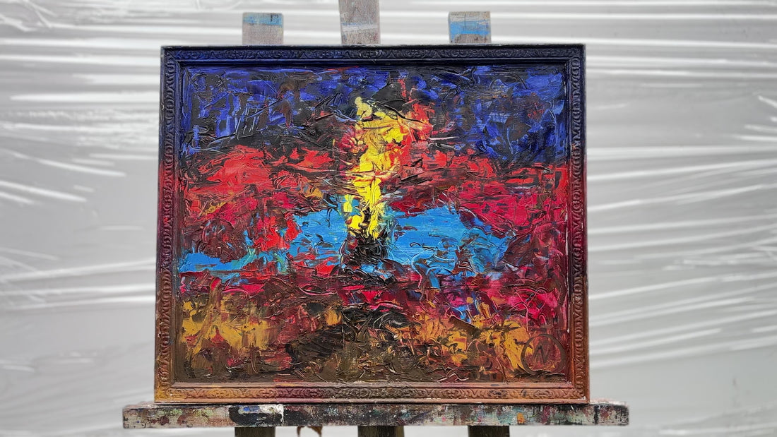 This painting presents a powerful vertical burst of energy at the center of an abstract, heavily textured landscape. Through intense color contrasts and sculptural impasto, the piece evokes movement, heat, and a sense of something emerging or igniting within a chaotic environment.