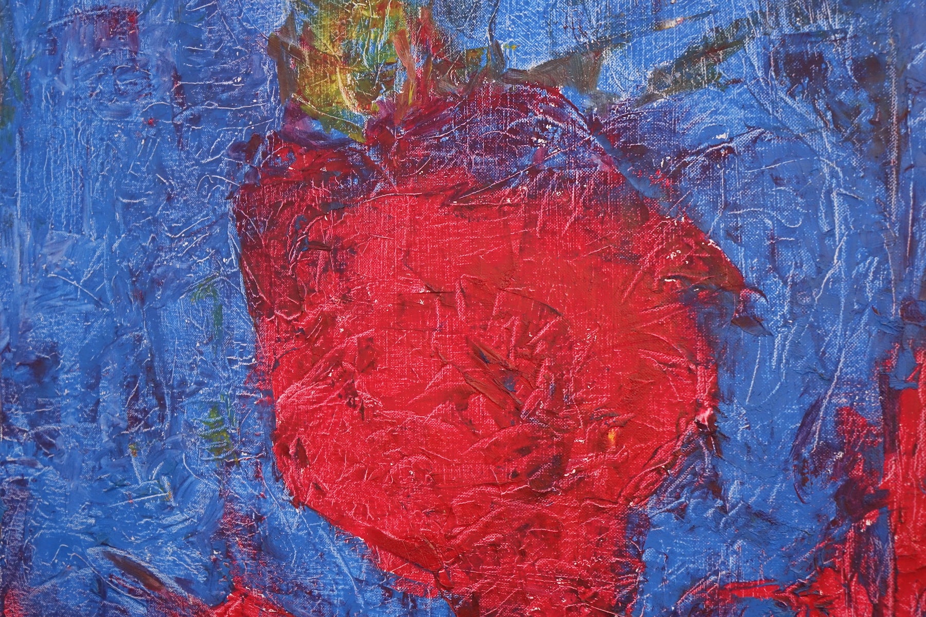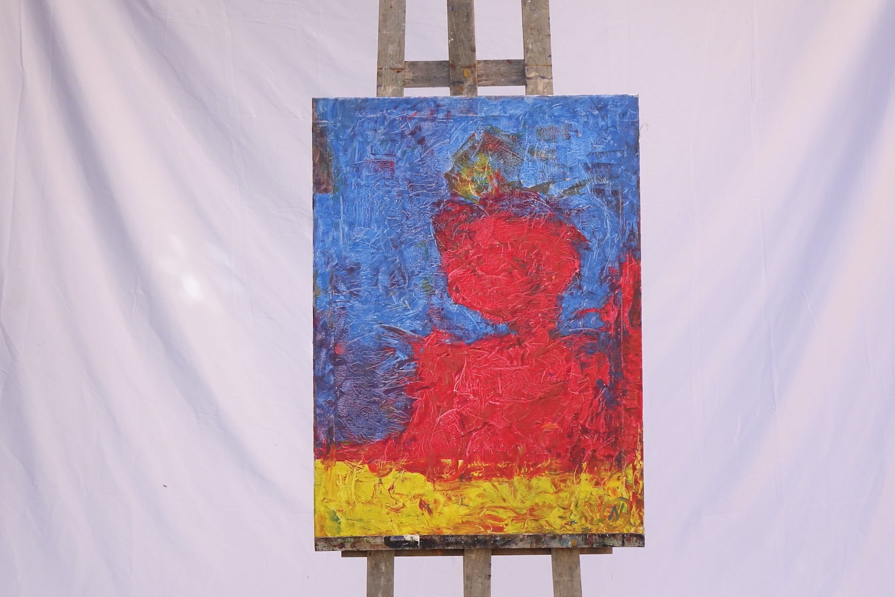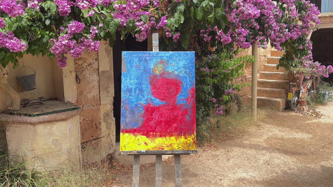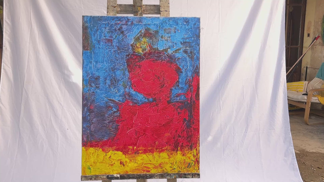 Redhead is a striking and bold composition dominated by a bright red figure set against a vivid blue and yellow background. The expressive texture and minimalistic abstraction create a powerful portrait that radiates energy, presence, and warmth — a celebration of individuality and color.