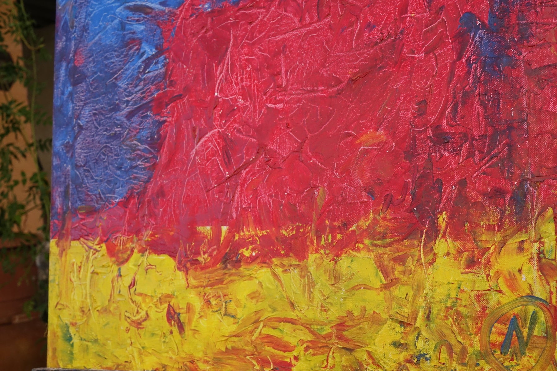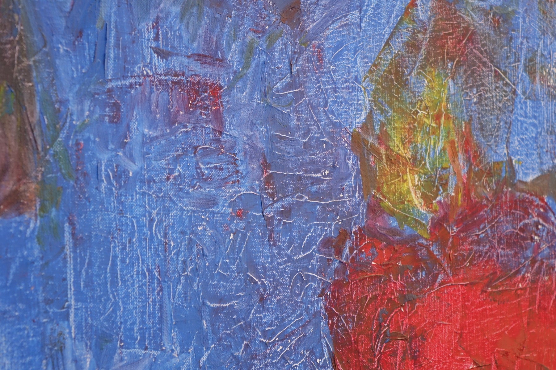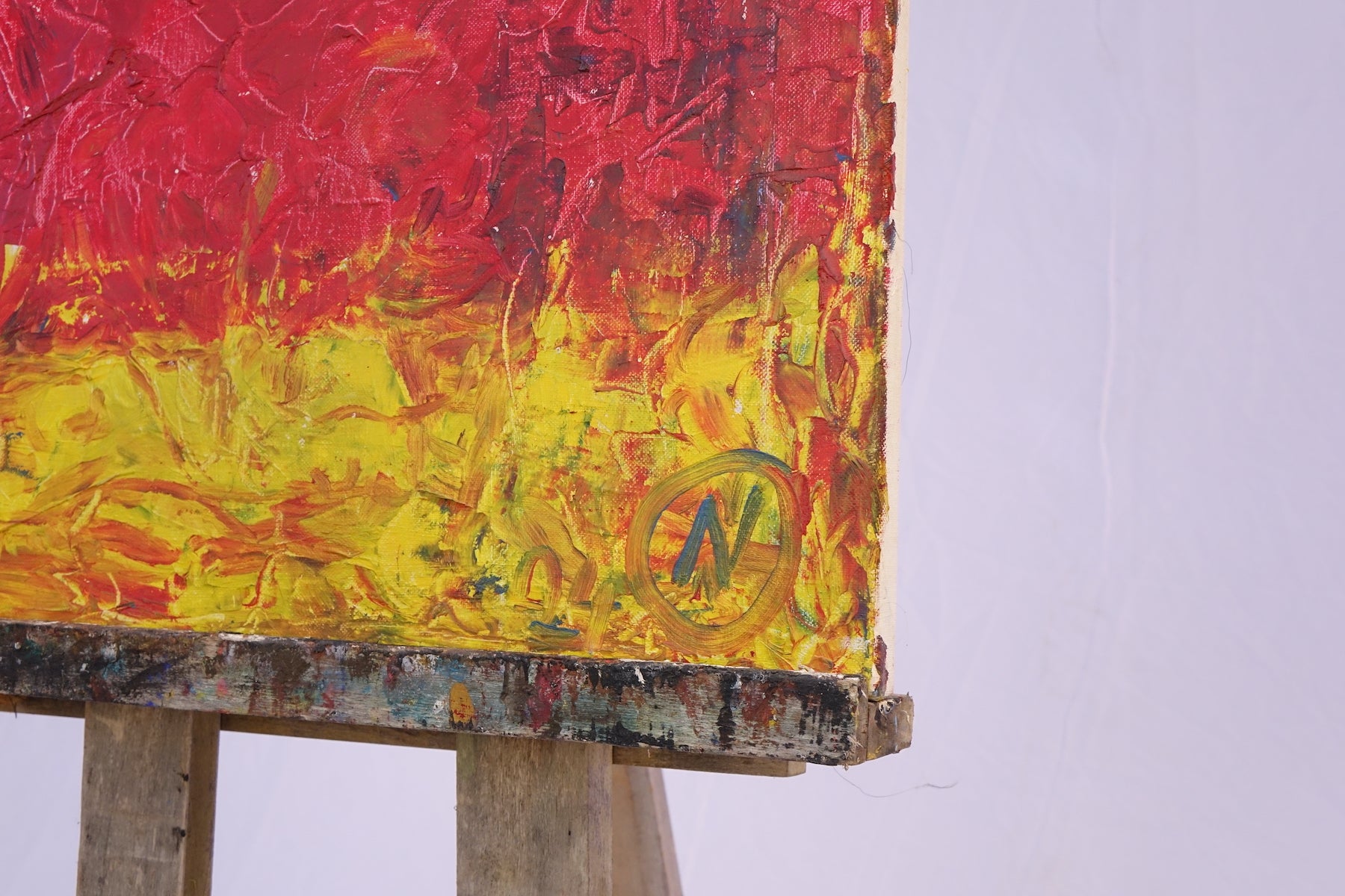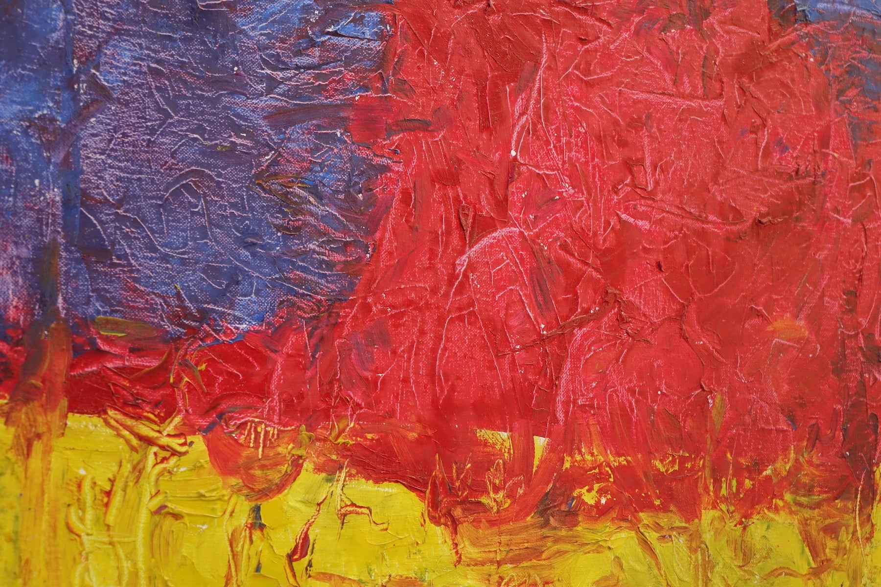 Redhead is a striking and bold composition dominated by a bright red figure set against a vivid blue and yellow background. The expressive texture and minimalistic abstraction create a powerful portrait that radiates energy, presence, and warmth — a celebration of individuality and color.