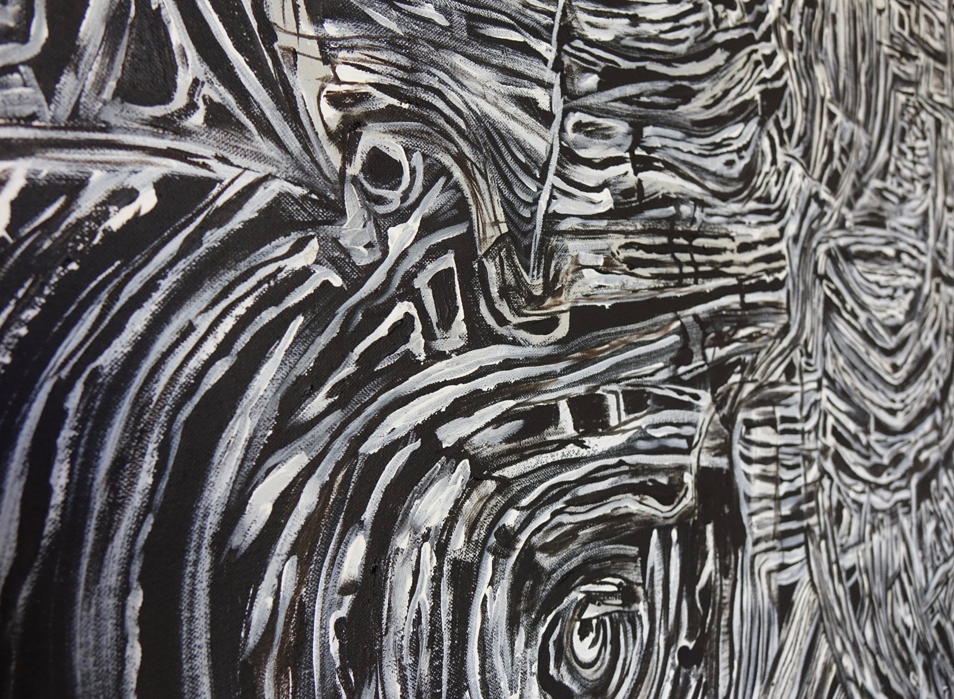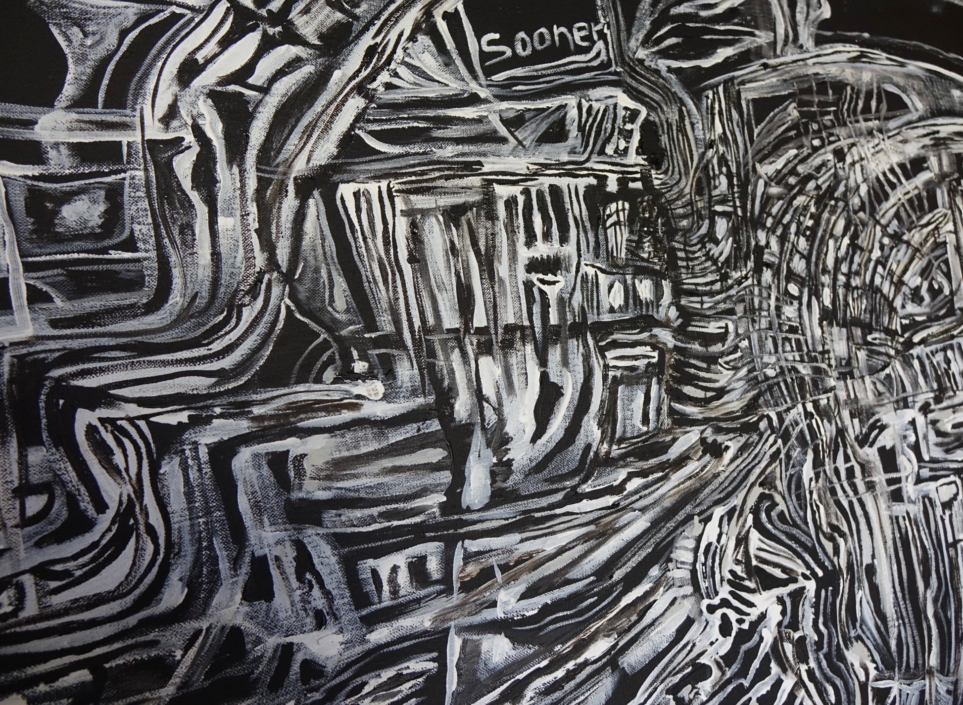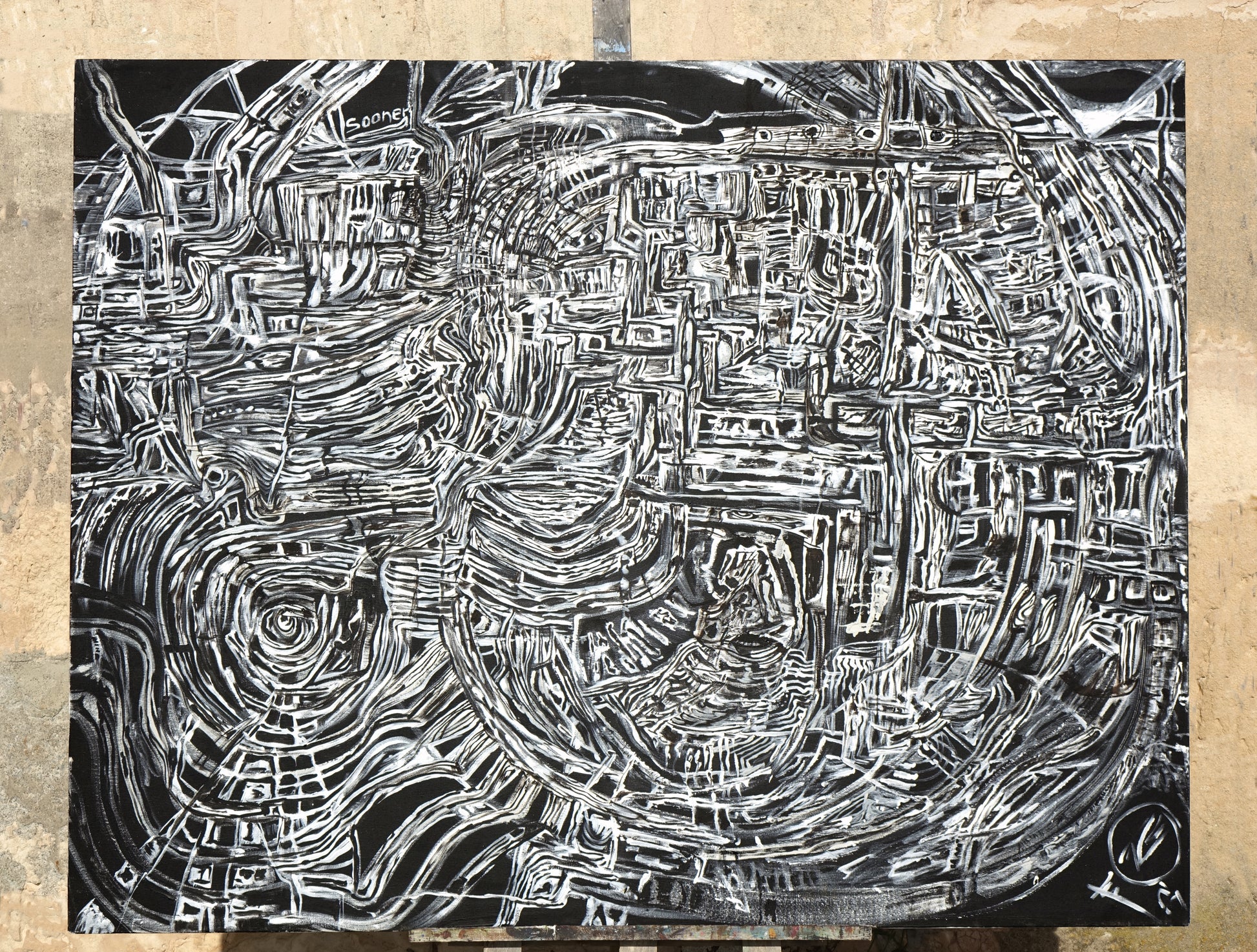 A rush of movement, layers circling inward and outward. “Sooner” reflects urgency—of decisions, change, and presence. Lines spiral with tension, echoing a moment just before things unfold.