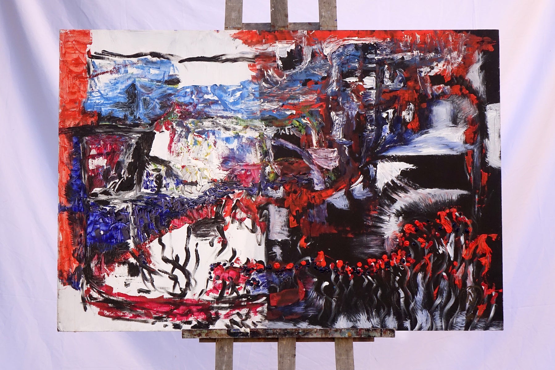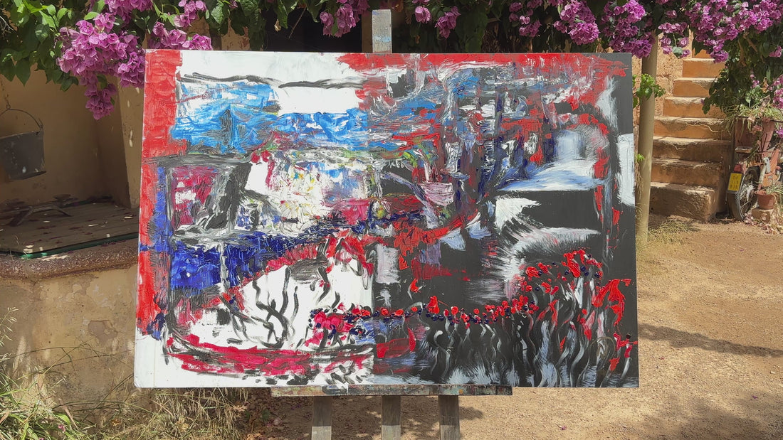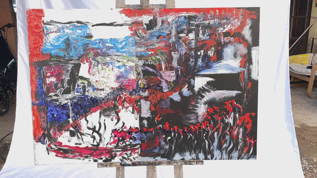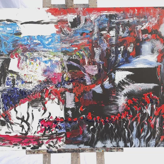 Union Jack is a bold, multi-layered composition built from four fragmented yet interconnected scenes — each pulsing with its own energy, yet joined together like the crossbars of a flag. The structure recalls the Union Jack, but instead of nationalism, it expresses the universal power of reunion and shared experience. The piece radiates vitality, with streaks of red and deep blue meeting moments of bright clarity. It invites us to gather, to reflect, and to connect — a visual affirmation that when lives intersect, something radiant always emerges.