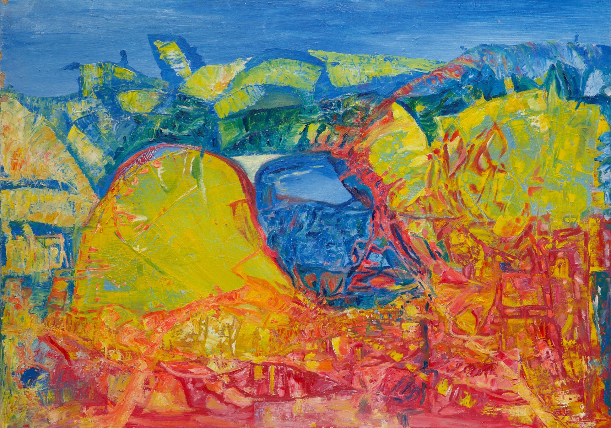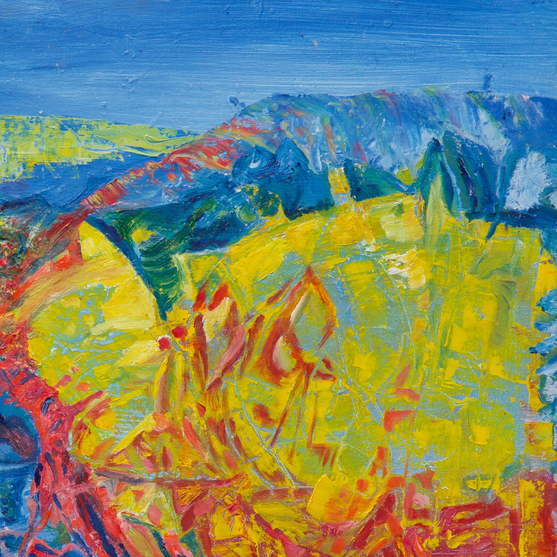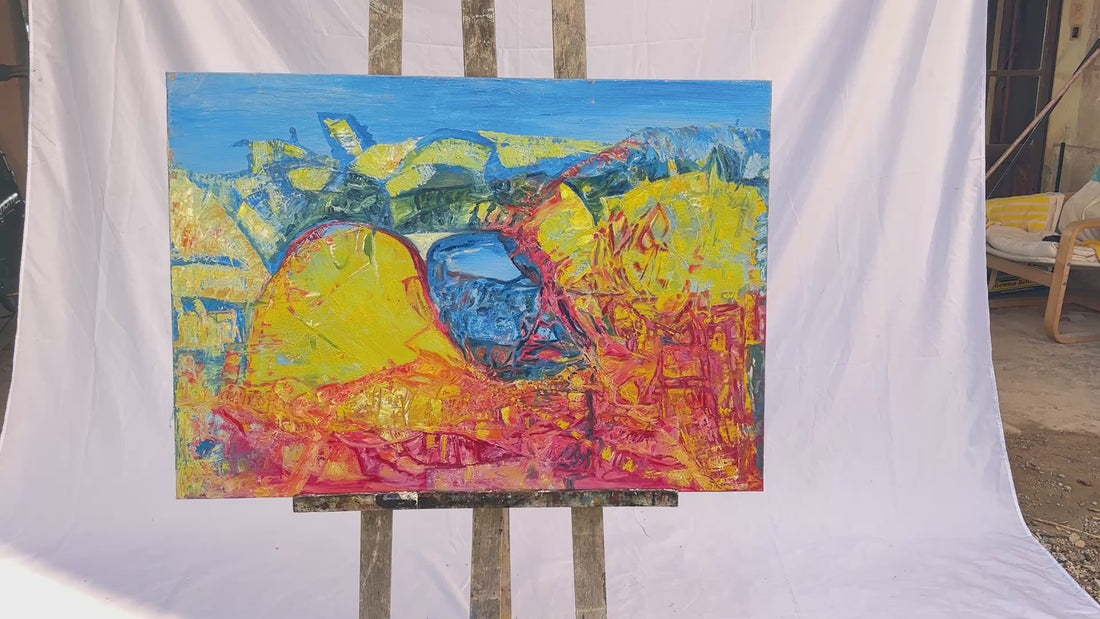 Vistonia is a vivid and joyful landscape full of luminous yellows, deep blues, and fiery reds. The painting’s abstracted forms suggest hills, skies, and fields viewed through an emotional lens — a place between memory and imagination, evoking warmth, energy, and Mediterranean light.