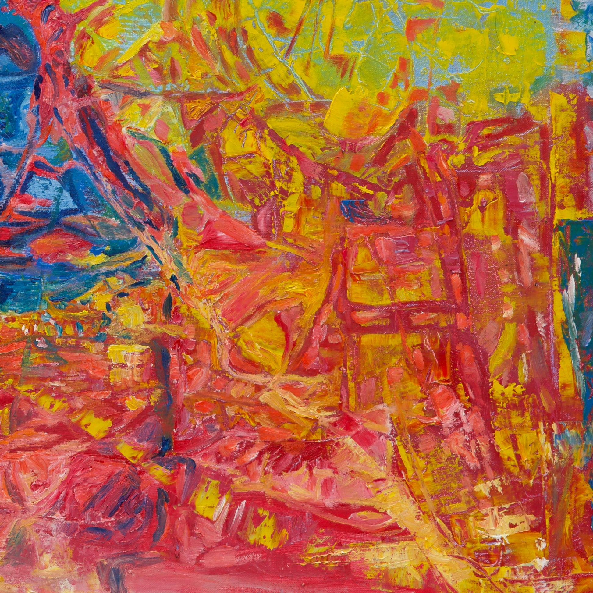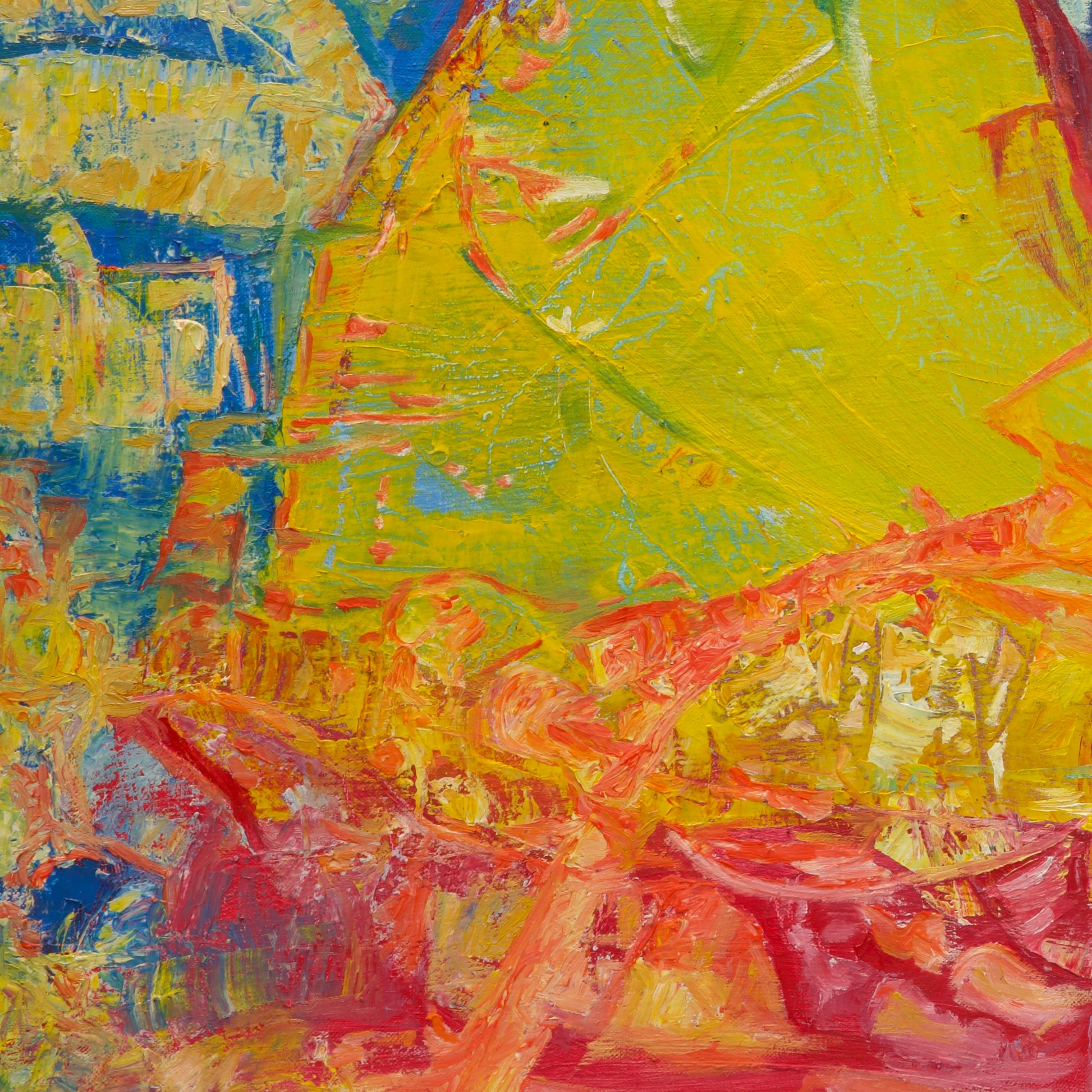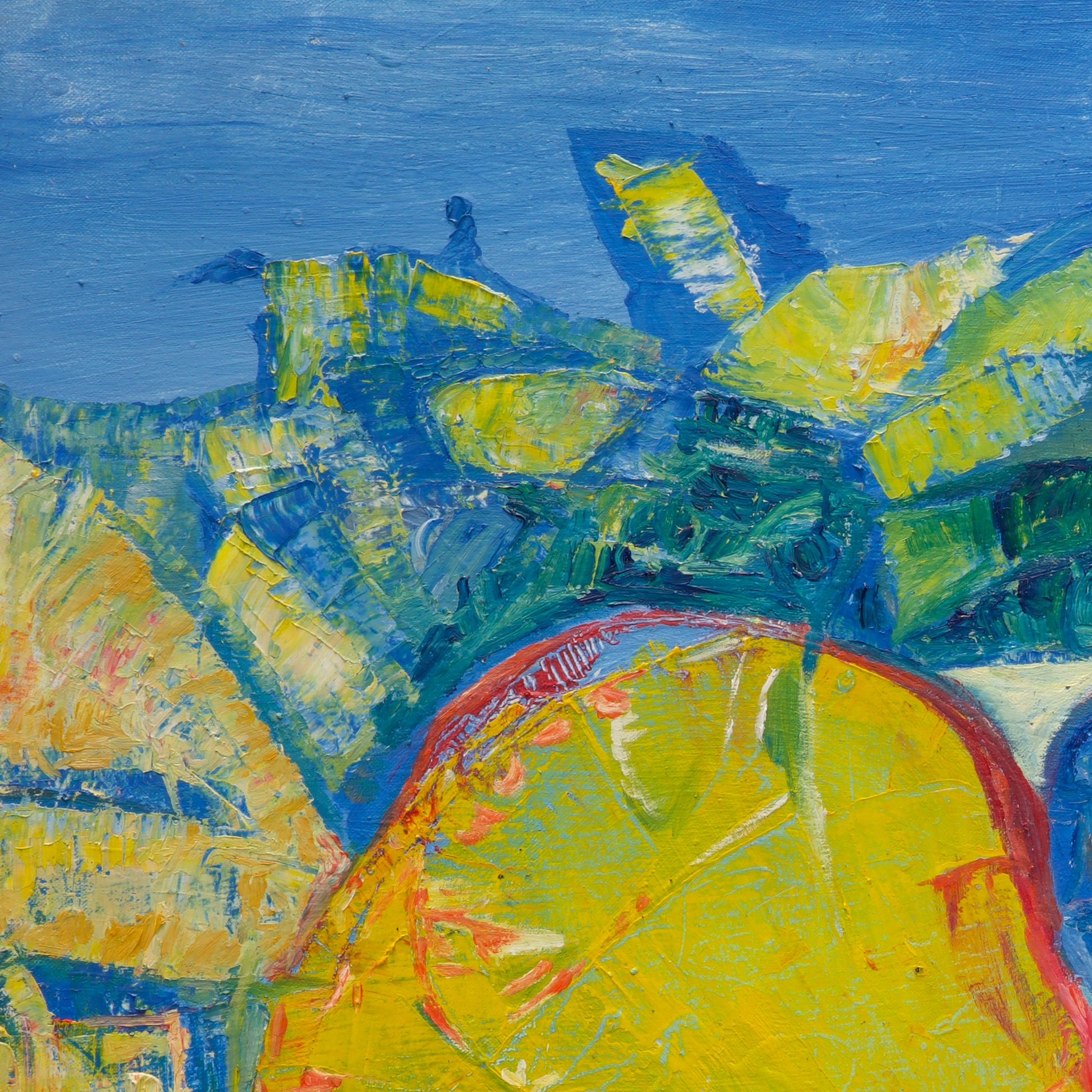 Vistonia is a vivid and joyful landscape full of luminous yellows, deep blues, and fiery reds. The painting’s abstracted forms suggest hills, skies, and fields viewed through an emotional lens — a place between memory and imagination, evoking warmth, energy, and Mediterranean light.