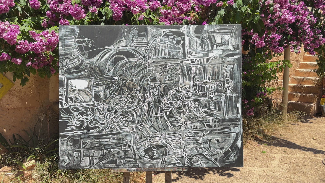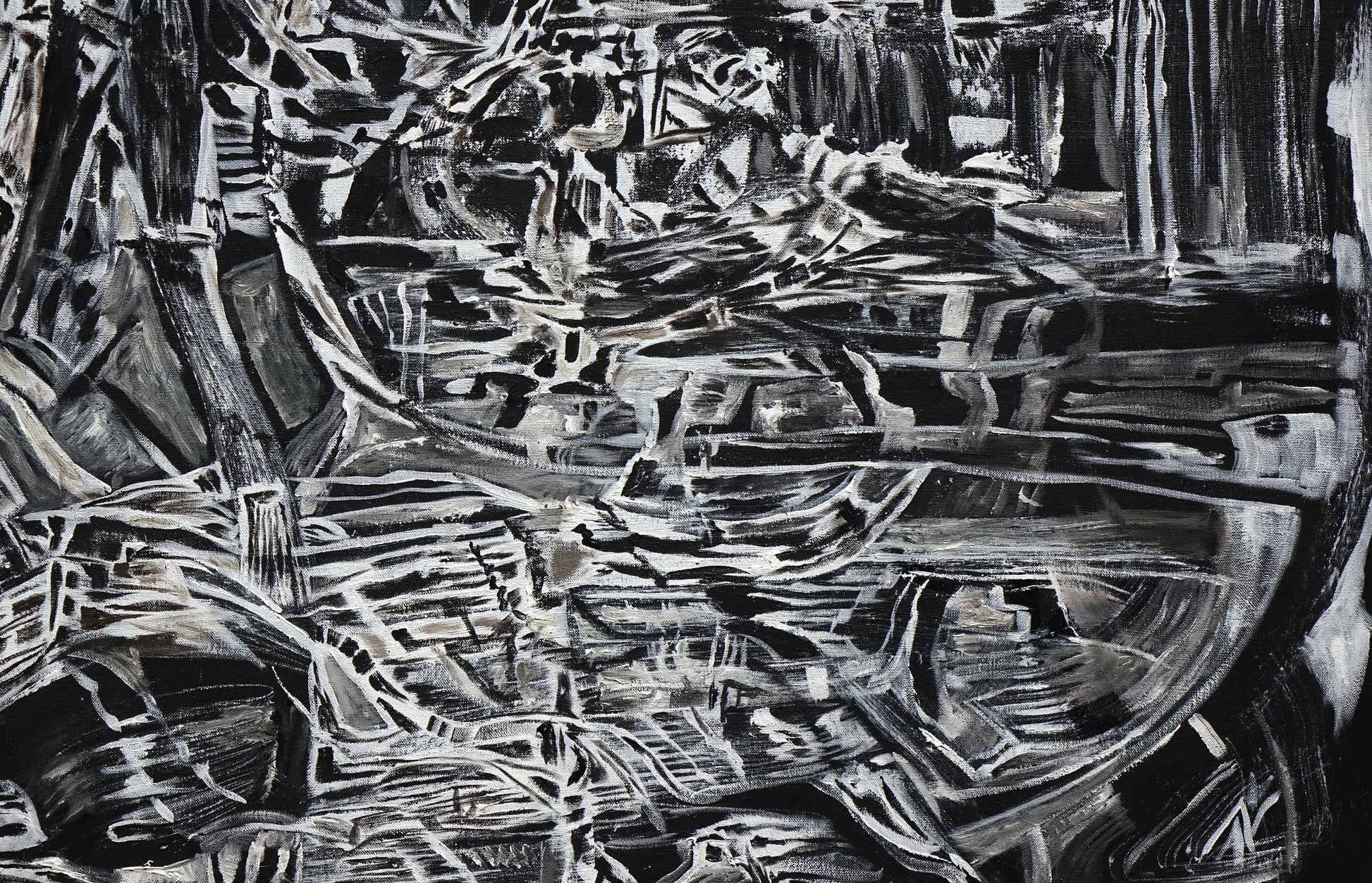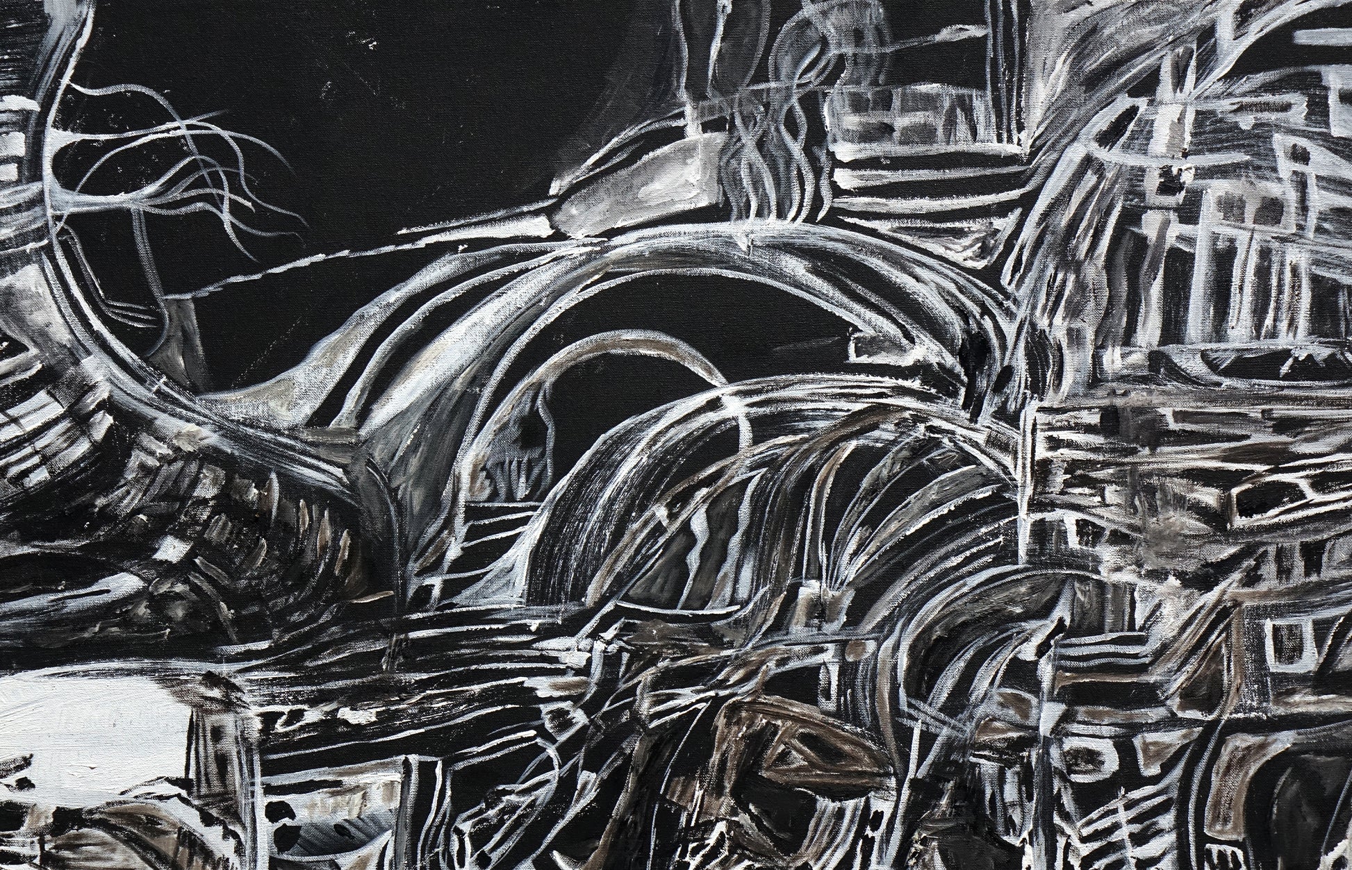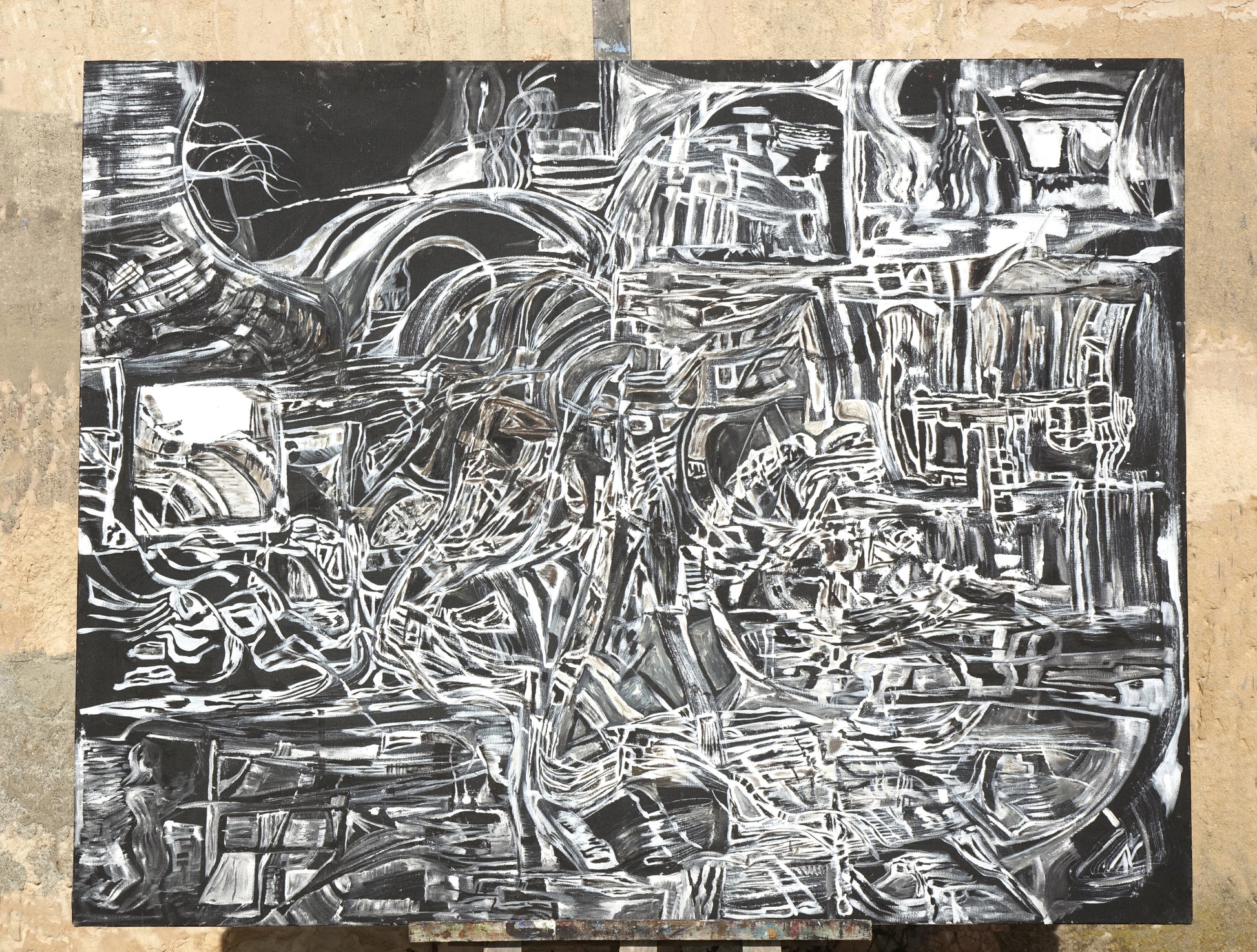 Week in Black and White captures a concentrated burst of artistic transformation — a week spent stepping into new terrain, breaking habits, and exploring fresh ways of bringing paint to life. The monochrome palette sharpens the focus on movement, gesture, and structure, allowing the lines to carry the energy of invention. Dense networks of marks seem to map both thought and feeling, tracing the raw territory of creation. It is a record of experimentation, risk, and the quiet power of beginning again.